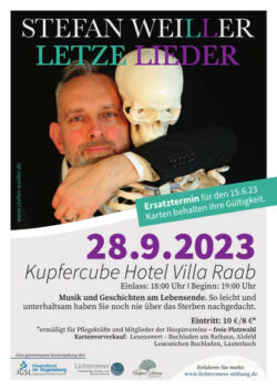 Veröffentlicht am 29.08.2023 um 13:51UhrAm 08.09.startet unsere Kartenvorverkauf für unsere Lesung mit Stefan Weiler „Letzte Lieder“ am 28.09. in der Villa Raab. Die Veranstaltung vom 15.06. mussten wir verlegen und freuen uns sehr, nun noch Karten für den neuen Termin anbieten zu können. Diese erhält man in den Buchläden Lesenswert Alsfeld und Lesezeichen Lauterbach. Alle bereits erworbenen Tickets behalten ihre Gültigkeit.